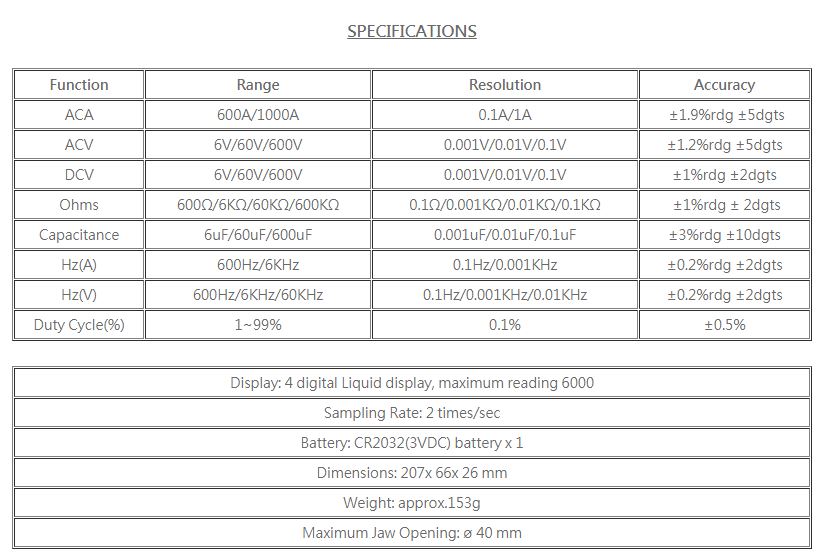 • Slim and Lightweight Size • True RMS Measuring • Measuring Current : AC 1000A • Data Hold Function • 1ms Peak Hold Function • Capacitor Function • Measuring Frequency From Current Clamp & Test Terminal • Auto Power Off • Autoranging