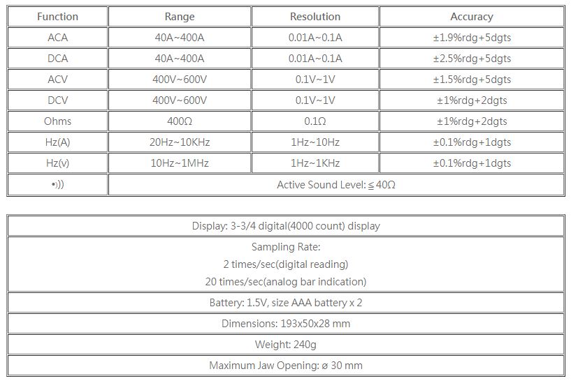 • AC/DC Current • Pocket Size • High Speed Bargraph • Data Hold Function • Touch Zero Function • Autoranging • Auto Power Off • Resolution 0.01A, 0.1V • Measuring Frequency From Current Clamp & Test Terminal