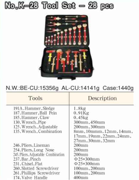 Bộ dụng cụ bằng đồng chống cháy nổ No.K-28