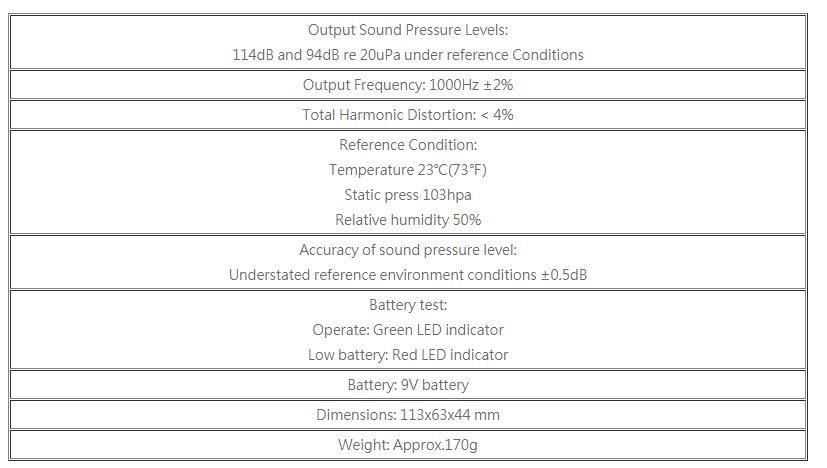 • 94dB And 114dB Sound Calibrator At 1KHz • Accurate And Simple To Use • Fits 1inch And 1/2inch Microphones • Low Battery Indicator • IEC 60942(2003) Class 2, Ans1.40-1984