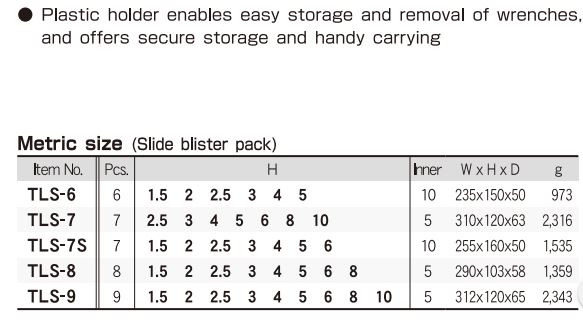 Các model thường gặp của dòng sản phẩm Bộ lục giác Eight TLS-* là : TLS-6. TLS-7, TLS-7S, TLS-8, TLS-9.