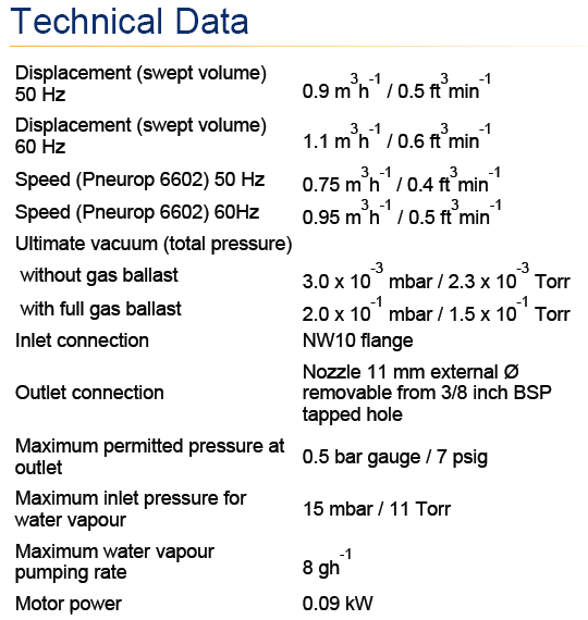 Bơm hút chân không Edwards E2M0.7 có lưu lượng max: 1.1 m3/h, có độ chân không max: 0.2 mbar (0.15 torr). Đây là loại bơm chân không nhỏ, dùng chủ yếu trong phòng thí nghiệm, độ bền cao, tiếng ồn thấp.