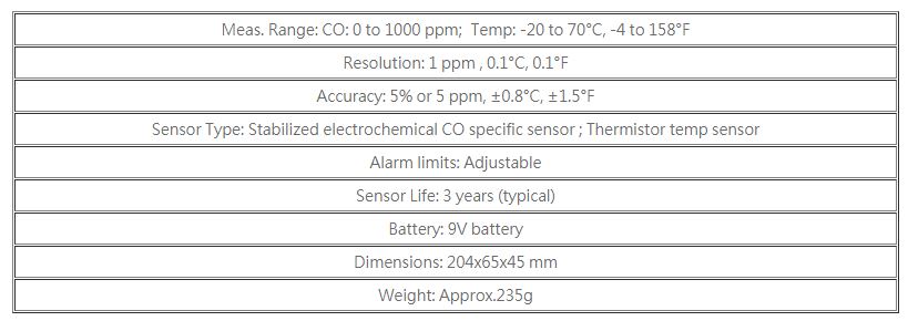• Large LCD dual displays for CO and TEMP measurement