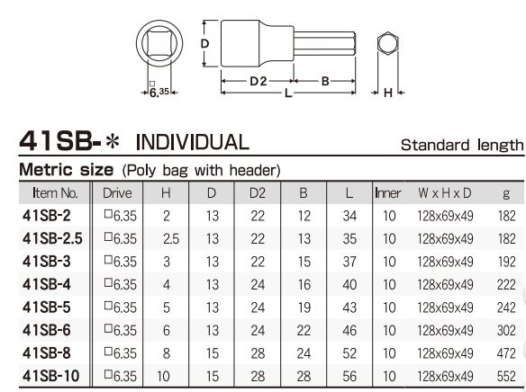 Các model thường gặp của bộ sản phẩm Đầu lục giác Eight dòng 41SB-* là : 41SB-2, 41SB-2.5, 41SB-3, 41SB-4, 41SB-5, 41SB-6, 41SB-8, 41SB-10.