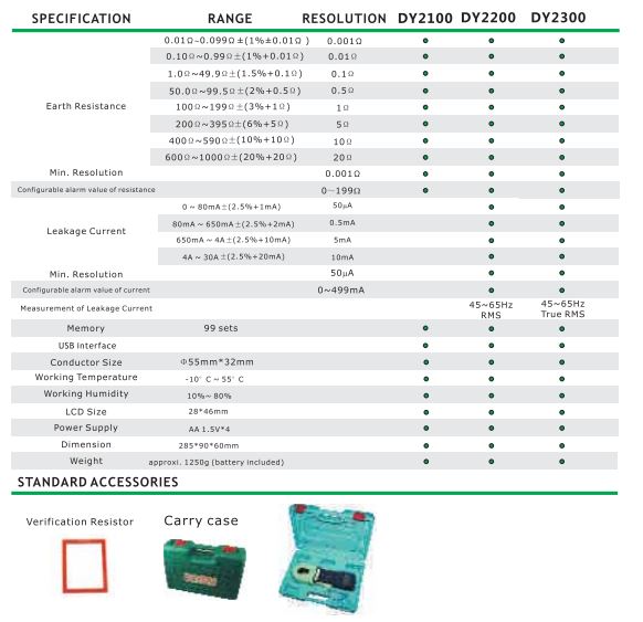 RMS AC Rò rỉ phạm vi hiện tại từ 10mA đến 30.00A với độ phân giải 50 DaoA (chỉ dành cho DY2200)