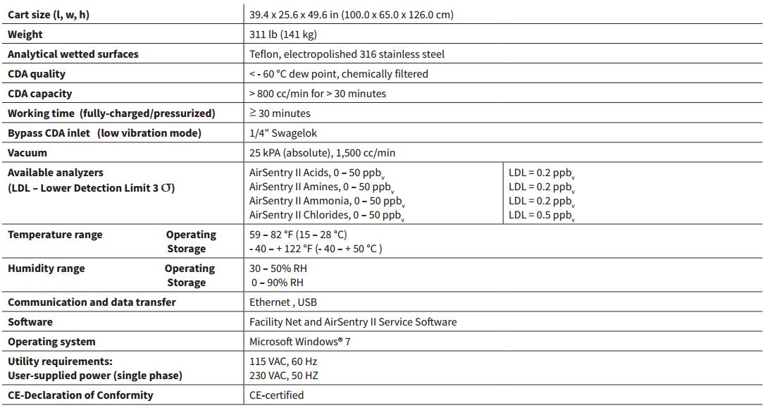 Hệ thống phát hiện giám sát AMC di động , để giám sát các phần tử gây ô nhiêm không khí trong phòng sạch. Độ nhạy Air Sentry II IMS phân tích phát hiện axit, amin, amoniac và clorua , pin dự phòng cho phép hoạt động hơn 30 phút, PC Touch và phần mềm cho phép vẽ đồ thị theo thời gian thực và lưu trữ giữ liệu. tùy chọn giao tiếp không dây