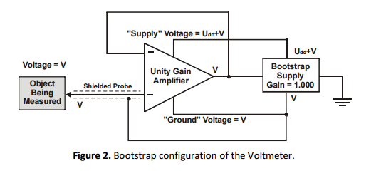 Công nghệ mạch tự khởi động: bao gồm việc nâng cao nối đất và điện áp nguồn của mạch khuyếch đại mẫu điện áp đầu vào và điện áp đo đầu vào. Hình 2, đầu ra của bộ khuyếch đại bằng điện áp trên mẫu đo. Điện áp này được áp dụng cho mạch nguồn(nguồn của mạch tự khởi động ) để tạo ra điện áp tham chiếu Udd +V và V. Đầu đo tiếp cận với đối tượng cần đo, đối tượng gây ra điện áp của nó lên đầu đo. Bởi thời gian đầu đo tiếp xúc với vật mẫu được kiểm tra, sẽ không có sự khác biệt về điện áp giữa đối tượng và đầu đo hoặc giữa đối tượng và lá chắn đầu đo. Điều này làm giảm đáng kể những tác động của điện trở hoặc điện dung tải của đối tượng cần đo bởi vôn kế cũng loại trừ khả năng của việc ESD với lá chắn đầu đo.