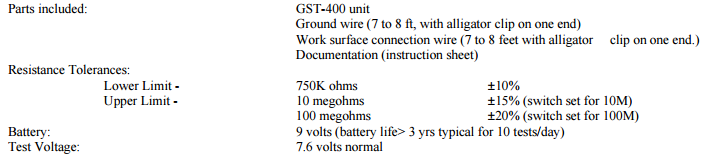 The GST-400 should be located on or near a work station. Installation of the GST-400 consists of connecting the GND post on the back of the unit to ground and the AUX post on the back of the unit to the work surface, using the wires provided, and selecting the desired range for the upper limit. The upper limit should be selected based on the ESD sensitivity of the components being handled by the operator. The GST-400 case must be isolated from ground, with only the rubber feet touching the work surface.