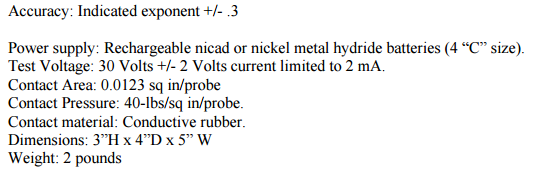 A voltage, V(30 Volts), is applied to the grounding cable which is connected to ‘ESD’ ground. The center probe contact (spring loaded) provides a ground return of the current supplied by the grounding cable. The resistance to ground of the material being measured is expressed as ten to some power, written as Ohms = 10^x.