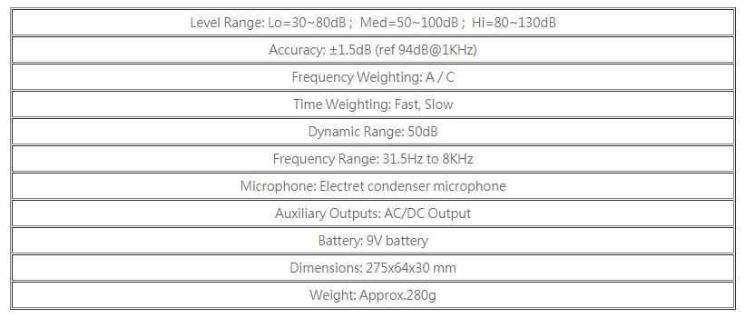 • 4 Digits Display • Max/Min Function • Level Range Display • Resolution 0.1dB • AC/DC Signal Output • IEC 651 TYPE II