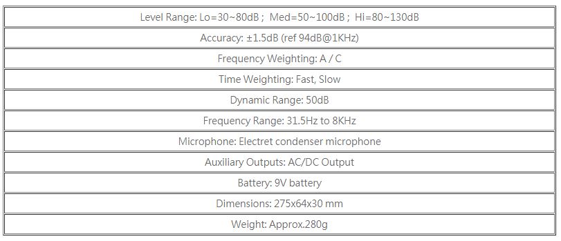 • PC Interface • Bargraph Indication • Max/Min Function • Auto Ranging (30~130dB) • Resolution 0.1dB • Level Range Display • AC/DC Signal Output • Auto Power Off • IEC 651 TYPE II