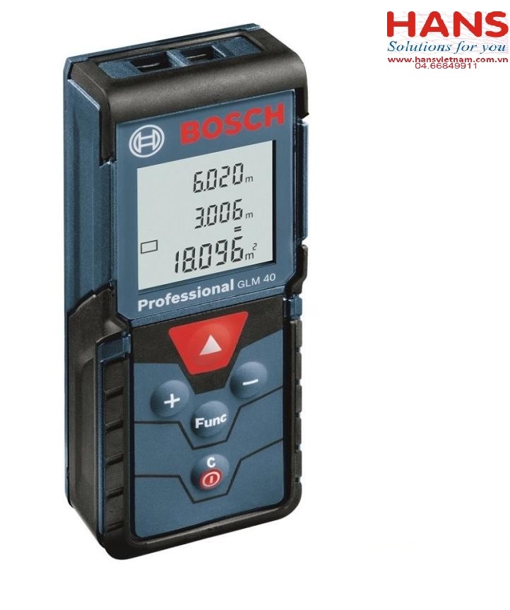 Máy đo khoảng cách Laser 40m Bosch GLM 40 là thiết bị đo laser cầm tay nhỏ gọn và mãnh mẽ, nó cung cấp một giải pháp chính xác cho các ứng dụng đo trong nhà hàng ngày. Máy được thiết kế bàn phím 5 nút tiện lợi cho các chức năng đo lường đơn giản như chiều dài, liên tục, diện tích, khối lượng, ngoài ra GLM 40 còn đước cải tiến thêm chức năng và bộ nhớ lưu được 10 kết quả đo. Máy nặng chỉ 100 gram, nó là một công cụ tiện dụng cho tất cả các ngành nghề, GLM 40 được thiết kế IP 54 với tính năng chống bụi và chống ẩm. Màn hình hiển thị 3 dòng và tự động chiếu sáng bằng đèn nền, đảm bảo kết quả là dễ dàng để đọc