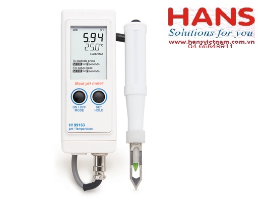 Máy đo PH/nhiệt độ cầm tay cho thịt Hanna HI99163: Hoạt động dựa trên bộ vi xử lý và một đầu dò đặc biệt. Điện cực FC232D được thiết kế đặc biệt với đầu nhọn bằng thép không gỉ có thể đâm xuyên qua thịt. Thêm vào đó, đầu dò nhiệt độ tích hợp điện cực PH cho phép hiện đồng thời kết quả đo nhiệt độ và PH và bộ khuếch đại nhỏ giúp cho các kết quả đo không bị ảnh hưởng bởi các yếu tố gây nhiễu