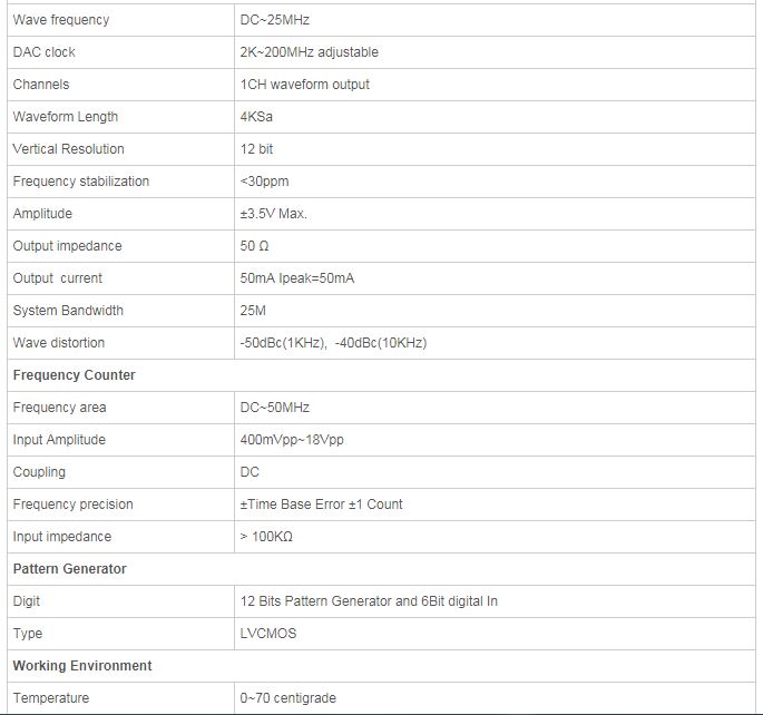 Tốc độ mẫu 200MSa / s, độ phân giải dọc 12 bit; 25Mz đầu ra dạng sóng tùy ý. (Sóng hình sin lên đến 75 MHz).