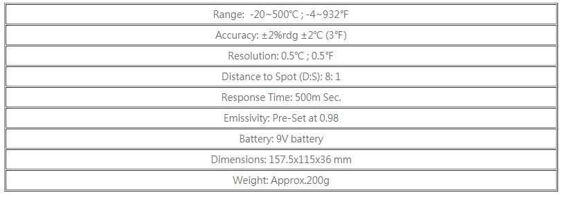 • Simple One-Handed Operation • Laser Targeting • LCD With Back Light • °C/°F Select Switch • Laser ON/OFF Switch • Automatic Power Off • Display Hold Function