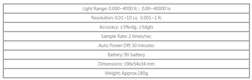 • 3 3/4 Digits Display • Auto Ranging • Automatic Power Off • Fc / lx Function Selectable • Hold Function • Range Display • Automatic Zero When Power On