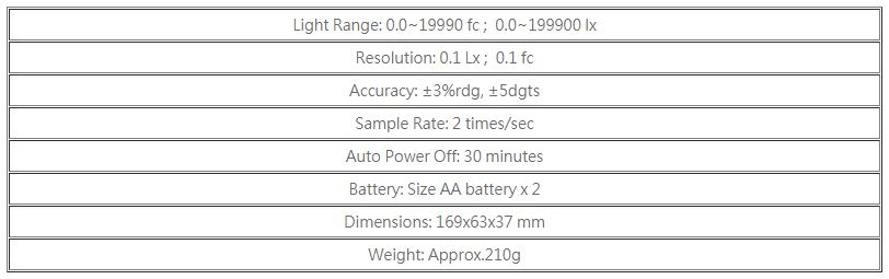 • 3 1/2 Digits, 1999 Count LCD • Fc / lx Function Selectable • Data Hold Function • Range Display • Big LCD Display • Automatic Zero When Power On • Detachable & Rotatable Light Sensor